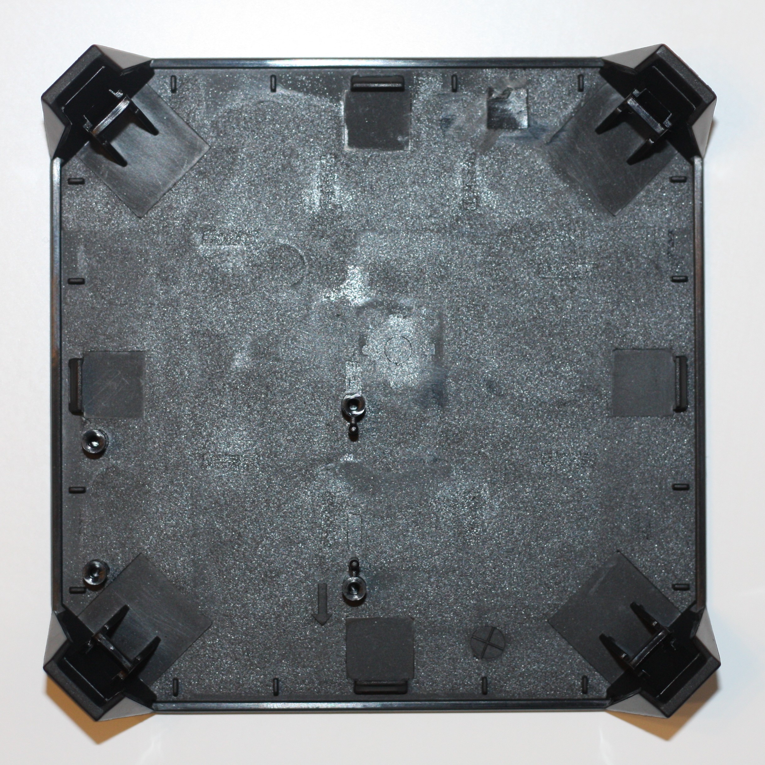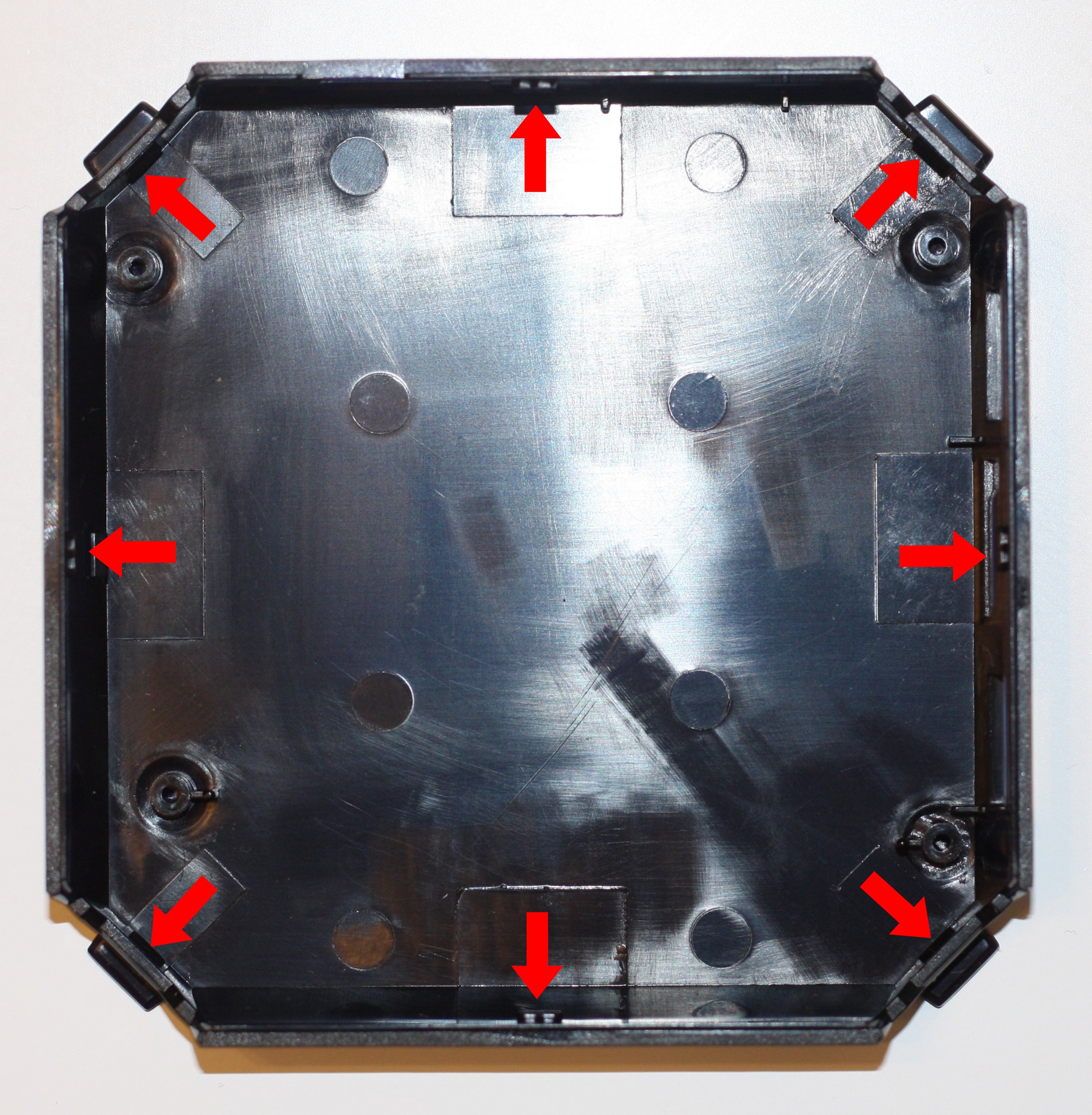 Части корпуса скрепляются между собой с помощью 8 защелок внутри корпуса. Нижняя часть корпуса (вид изнутри, стрелками указаны места расположения защелок):